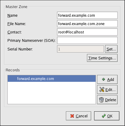 File Name — File name of the DNS database file, relative to /var/named. It is preset to the domain name with .zone appended to it.
