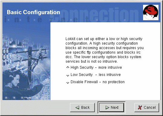 You should not try to use GNOME Lokkit to generate complex firewall rules. It is intended for average users who want to protect themselves while using a modem, cable, or DSL Internet connection. To configure specific firewall rules, refer to the Firewalling with iptables chapter in the Red Hat Linux Reference Guide.