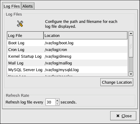 By default, the currently viewable log file is refreshed every 30 seconds. To change the refresh rate, select Edit => Preferences from the pulldown menu. The window shown in Figure 29-2 will appear. In the Log Files tab, click the up and down arrows beside the refresh rate to change it. Click Close to return to the main window. The refresh rate is changed immediately. To refresh the currently viewable file manually, select File => Refresh Now or press [Ctrl]-[R].