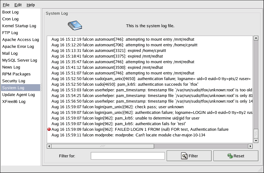 To view system log files in an interactive, real-time application, use the Log Viewer. To start the application, go to the Main Menu Button (on the Panel) => System Tools => System Logs, or type the command redhat-logviewer at a shell prompt.