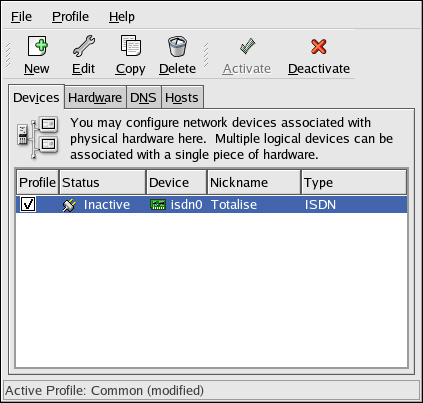 After adding the ISDN device, you can edit its configuration by selecting the device from the device list and clicking Edit. For example, when the device is added, it is configured not to start at boot time by default. Edit its configuration to modify this setting. Compression, PPP options, login name, password, and more can be changed.