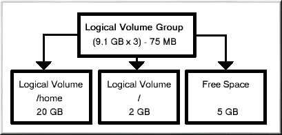 論理ボリュームグループは、 /home や /のような マウントポイントに割り当てられる論理ボリュームと、 ext3のような ファイルシステムに分けられます。「パーティション」が全容量まで満杯になると、パーティションの容量を 増やす為に、論理ボリュームグループの空き領域を論理ボリュームに追加することができます。新しいハード ドライブがシステムに追加される時、それは論理ボリュームグループに追加できます。そしてパーティション として存在する論理ボリュームは拡張することが出来ます。