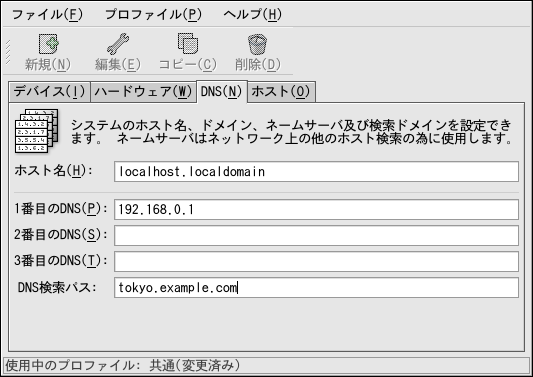 DNSタブは、システムのホスト名、 ドメイン、ネームサーバー、検索ドメインを設定します。 ネームサーバーはネットワーク上のほかのホストを調べる ときに使用します。
