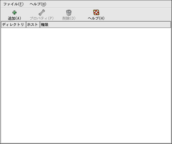 一覧からNFS共有を追加、編集、又は削除するためにOKボタンを クリックした後に、変更はすぐに反映されます。— サーバデーモンが再起動して 古い設定ファイルは/etc/exports.bakとして保存されます。新規の 設定は/etc/exportsに書き込まれます。