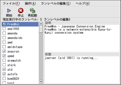現在選択しているランレベルでブート時にxinetd以外のサービスを スタート出来るようにするには、一覧内のサービスの名前の横のチェックボックスにチェックを 入れます。ランレベルを設定した後、プルダウンメニューからファイル => 変更を保存を選択して、変更を適用します。ランレベルの設定は 変わりますが、ランレベルは再起動されません。そのため、変更はすぐには反映されません。