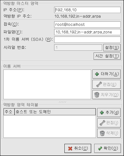 ¿ª¹æÇâ ÁÖ¼Ò Å×ÀÌºí — ¿ª¹æÇâ ¸¶½ºÅÍ ¿µ¿ª ³»ÀÇ IP ÁÖ¼Ò¿Í È£½ºÆ®¸íÀÇ ¸ñ·ÏÀÔ´Ï´Ù. ¿¹¸¦ µé¾î ¿ª¹æÇâ ¸¶½ºÅÍ ¿µ¿ª 192.168.10¿¡ ´ëÇÑ ¿ª¹æÇâ ÁÖ¼Ò Å×ÀÌºí¿¡ IP ÁÖ¼Ò 192.168.10.1¿Í È£½ºÆ®¸í one.example.com¸¦ ÇÔ²² ÀÔ·ÂÇÏ½Ç ¼ö ÀÖ½À´Ï´Ù. ¿ÏÀüÇÑ È£½ºÆ®¸íÀÓÀ» ³ªÅ¸³» ÁÖ±â À§ÇÏ¿© È£½ºÆ®¸í ¸¶Áö¸·¿¡´Â ¹Ýµå½Ã Á¡ (.)ÀÌ ¿Í¾ß ÇÕ´Ï´Ù.