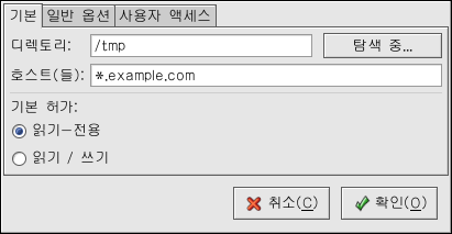 NFS ¼¹ö ¼³Á¤ µµ±¸´Â /etc/exports ¼³Á¤ ÆÄÀÏÀ» Á÷Á¢ ÀÐ°í ±â·ÏÇÕ´Ï´Ù. µû¶ó¼ ÀÌ µµ±¸¸¦ »ç¿ë ÈÄ ÆÄÀÏÀ» Á÷Á¢ ¼öÁ¤ °¡´ÉÇϸç, ÆÄÀÏÀÌ ¿Ã¹Ù¸¥ ±¸¹®À» »ç¿ëÇÏ¿© ¼öÁ¤µÈ °æ¿ì¿¡´Â ¼öµ¿À¸·Î ÆÄÀÏÀ» ¼öÁ¤ ÈÄ ´Ù½Ã ÀÌ µµ±¸¸¦ »ç¿ë °¡´ÉÇÕ´Ï´Ù.