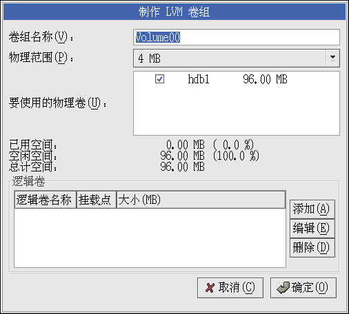 卷组内的所有逻辑卷必须按物理范围(physical extent)单位被分配。按照默认设置,物理范围被设置为 4 MB;因此,逻辑卷的大小必须能够被 4 MB 整除。如果你输入的大小不是 4 MB 的整倍数,安装程序将会自动选择最接近 4 MB 整倍数的数值。建议你不要改变这个设置。