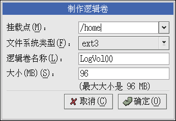 创建带有 /home 之类挂载点的逻辑卷。切记,/boot 不能够是逻辑卷。要添加逻辑卷,点击「逻辑卷」部分中的 「添加」按钮。一个如图 11-3所示的窗口就会出现。