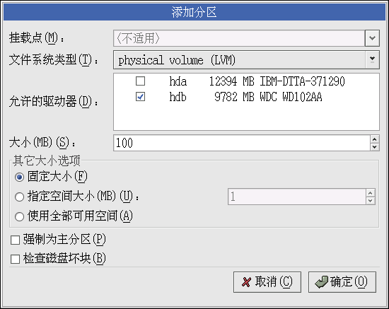 选择「固定大小」来使物理卷具备指定大小,选择「指定空间大小(MB)」,输入以 MB 为单位的大小来给物理卷大小一个范围,或选择「使用全部可用空间」来使它的大小扩充到填满整个硬盘的可用空间。如果你有不止一个可扩展的物理卷,它们会分享磁盘上的可用空闲空间。