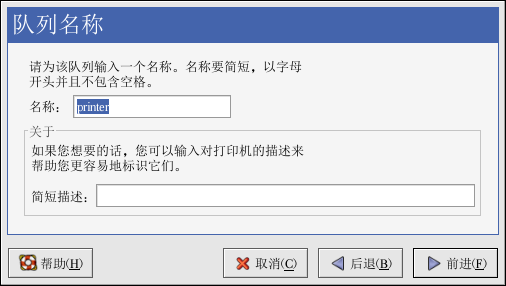 在如图 27-3所示的窗口中,在「名称」文本字段中输入一个独特名称。打印机名称不能包含空格,必须以字母开头。打印机名称可以包含字母、数字、短线(-)和下划线(_)。你还可以输入关于打印机的简短描述,其中可以包含空格。