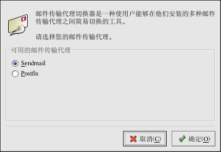该程序会自动检测 X 窗口系统是否在运行。如果它在运行,该程序就会在图形化模式中启动,如图 23-1所示。如果没有检测到 X,它就会在文本模式中启动。要强制 邮件传输代理切换器 在文本模式下运行,使用 redhat-switch-mail-nox 命令。