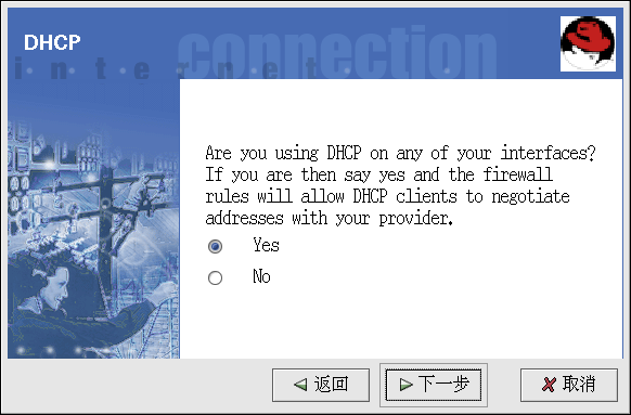 如果你使用 DHCP 来激活系统上的任何以太网接口,你必须对 DHCP 问题回答「Yes」。如果你回答了“No”,你将无法使用以太网接口来建立连接。许多电缆和 DSL 互联网提供者要求你使用 DHCP 来建立互联网连接。