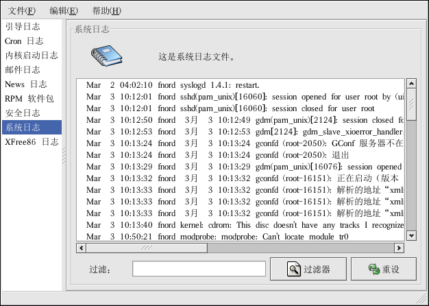 要在互动的、真实时间的应用程序中查看系统日志文件,使用 日志查看器。要启动这个应用程序,点击面板上的「主菜单」 => 「系统工具」 => 「系统日志」,或在 shell 提示下键入 redhat-logviewer 命令。