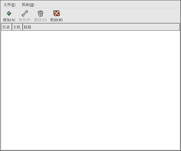要使用 NFS 服务器配置工具,你必须运行 X 窗口系统,具备根特权,并且安装了 redhat-config-nfs RPM 软件包。要启动这个程序,点击面板上的「主菜单」 => 「系统设置」 => 「服务器设置」 => 「NFS 服务器」,或键入 redhat-config-nfs 命令。