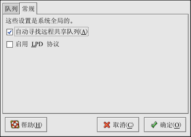 「自动寻找远程共享队列」 — 被默认选择。这个选项启用 IPP 浏览,这意味着当网络上其它机器广播它们拥有的队列时,这些队列会被自动添加到系统的打印机列表中;由 IPP 浏览所发现的打印机不需要额外的配置。该选项不自动共享本地系统上配置的打印机。