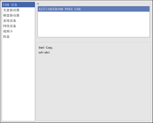 如果你在配置硬件时遇到问题,或者只是想了解一下你的系统中有哪些硬件,你可以使用硬件浏览器 程序来显示能被探测到的硬件。要在桌面环境下启动该程序,点击「主菜单」 => 「系统工具」 =>「硬件浏览器」,或在 shell 提示下键入 hwbrowser。如图 26-3所示,它显示了你的光盘设备、软盘、硬盘驱动器和它们的分区、网络设备、指示设备、系统设备、以及视频卡。点击左侧菜单上的类别名称,有关信息就会被显示。