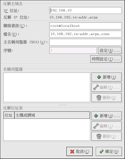 反解位址表 — 位於反解主網域中的 IP 位址清單以及它們的主機名稱。 舉例來說,對於反解主網域 192.168.10,您可以新增 192.168.10.1 與它的主機名稱 one.example.com 到 『反解位址表』。 主機名稱必須以句號結束,以代表它是一個完整的主機名稱。