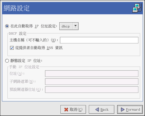 在如 圖形 12-2 所示的 『網路設定』 視窗中,請選擇 DHCP 或一個靜態的 IP 位址。 假如在每次啟動網路時,這個裝置都接收到一個不同的 IP 位址,請不要指定一個主機名稱。 點選 下一步 繼續。