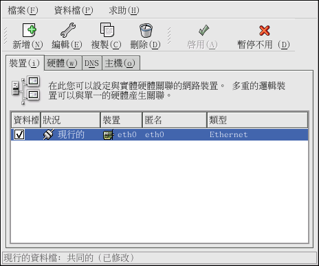 安裝程式會偵測有支援的乙太網路裝置,並提示您來設定它們。 假如您在安裝過程中有設定任何的乙太網路裝置,它們將會出現在 『硬體』 標簽頁中的硬體清單。 |