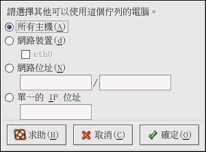 預設情況下,在選取要共享的佇列後,所有的 主機都允許列印到共享的印表機。 允許網路中的所有系統列印到佇列是一件危險的事,特別是當系統直接連線到網際網路時。 建議您更改這個選項,您可以選取 All hosts 的紀錄再點選 編輯 按鈕來顯示如 圖形 27-18 所示的視窗。