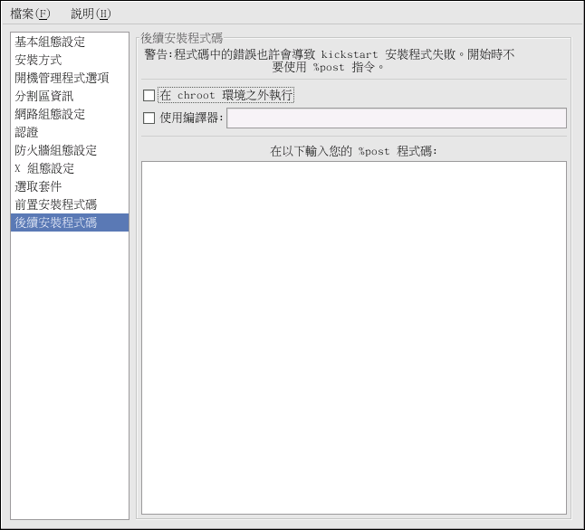 如要在 chroot 環境之外執行後續安裝的程式碼,請點選 『後續安裝程式碼』 視窗頂端該選項旁的選取盒。 這等於您在 %post 部份使用 --nochroot 的選項。
