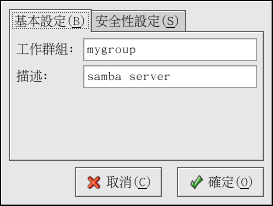 在『基本設定』 的標簽頁中,請指定這個電腦所屬的工作群組,以及關於這部電腦的一個簡短的描述。 這兩個欄位等同於 smb.conf 設定檔中的 workgroup 與 server string 選項。