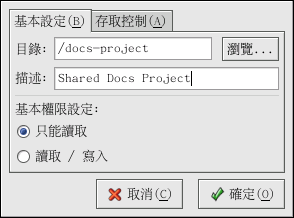 Samba 伺服器設定工具 是用來管理 Samba 共享資源、使用者與基本伺服器設定的一個圖形化介面。 它將同時修改位於 /etc/samba/ 目錄中的設定檔案,而且將會保留任何非使用這個應用程式所做的變更。