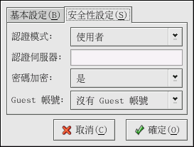 Guest 帳號 — 當使用者或 guest 使用者登入到一部 Samba 伺服器,必須對應他們到伺服器上一個有效的使用者。 請選取系統上一個既有的使用者名稱來當作 guest Samba 帳號。 當 guest 登入到 Samba 伺服器時,他將與該使用者擁有相同的權限。 這個設定等同於 guest account 選項。