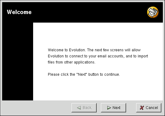 The first time you start Evolution you will be presented with the Welcome Screen (Figure 7-1), which allows you to configure your email connection. Follow the on-screen instructions and fill in the information you collected from your ISP or administrator in the text boxes provided. When you are done, click Finish, and you will be presented with the Main Screen as shown in Figure 7-2.
