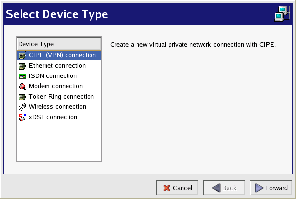 If you are connecting your Red Hat Linux computer to a wireless access point (WAP) or peer-to-peer (also called ad-hoc) network with a wireless (802.11x) network card, then you will need to configure your wireless device. Choose the Wireless Connection, then select the device from the list provided. You can then configure the device for DHCP or fixed IP addresses In the pop-up device configuration window.