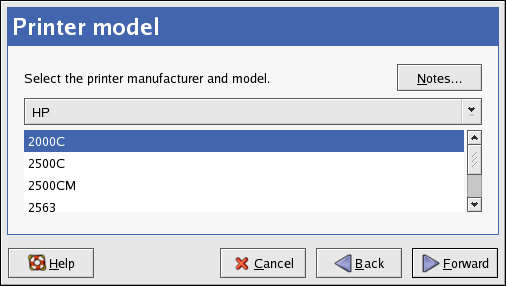 You will see a window similar to Figure 8-4. If it was not auto-detected, select the model from the list. The printers are divided by manufacturers. Select the name of the printer manufacturer from the pulldown menu. The printer models are updated each time a different manufacturer is selected. Select the printer model from the list.