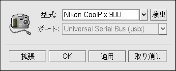 gtKamを使い始める前に、 ご使用のデジタルカメラと動作するよう設定する必要があり ます。メニューからカメラ => Add Camera...を選びます。 ポップアップダイアログが現れるのでドロップダウンリスト からご使用のカメラを選ぶか、検出 をクリックするとgtKamが 自動的にご使用のカメラを検出します。 適用をクリックして変更し、OK でダイアログボックスを閉じます。