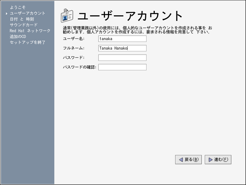 セットアップエージェントは、 最初に日常業務で使用するユーザーアカウントを設定 するよう指示してきます。システムを損傷したり、 誤ってファイルを削除する恐れがあるため、一般作業に rootアカウントでログインすることはおすすめできません。 セットアップエージェントでは、 ユーザー名、オプションで使用者の姓名(フルネーム)、 パスワード(2回入力する必要あり)を入力します。 これでRed Hat Linuxシステムへログインするために使用する ユーザーアカウントが作成され、ファイルを保存する ためのユーザーアカウント用ホームームディレクトリを システム上に持つことになります。