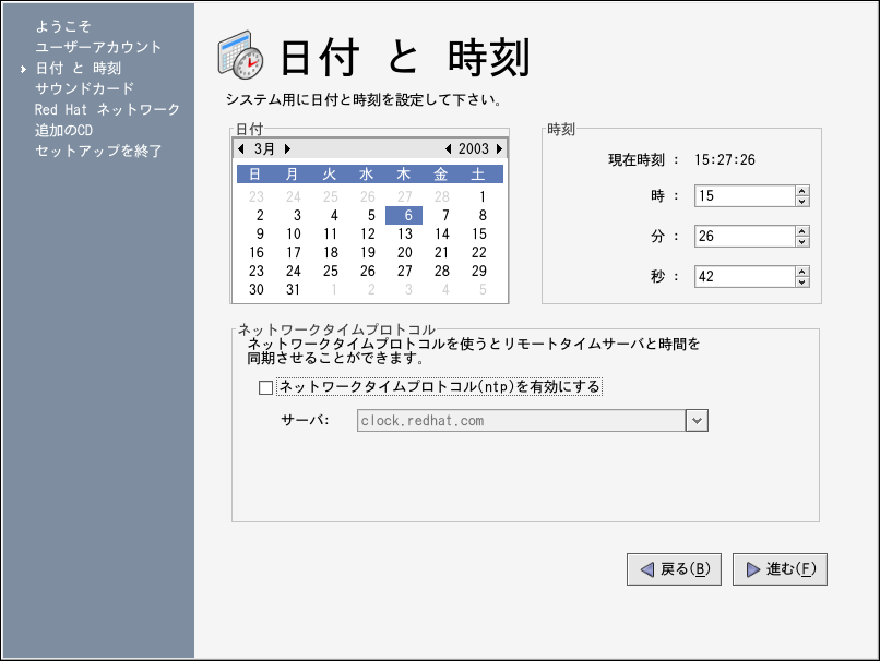 セットアップエージェントは手動で マシンの日付と時刻を設定することができます。 コンピュータのBIOS(ベーシック 出入力システム)で時計を調整します。日付、月、年を システムに設定するには、カレンダーインターフェースを 使用します。時間、分、秒を設定するには、用意されている テキストボックスを使用します。