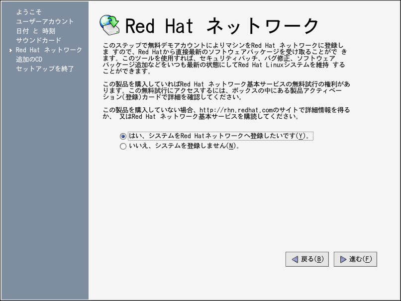 Red Hat ネットワークにシステムを登録してRed Hat Linuxシステムの更新を自動的に 受信するには、はい、Red Hat ネットワークに登録しますを 選択します。これによりRed Hat 更新 エージェントがスタートします — Red Hat ネットワークでの マシンの登録をステップバイステップで案内するユーティリティ。 いいえ、マシンを登録しませんを選択すると 登録を省略します。Red Hat ネットワークとマシンの登録に関する詳しい情報は http://www.redhat.com/docs/manuals/RHNetwork/ でRed Hat ネットワークドキュメントを参照してください。