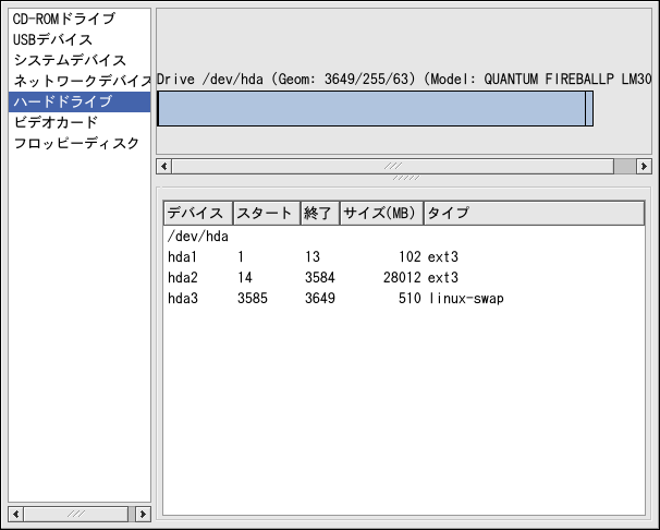 パネルからHard Drivesを選択 して、表示されているDisk Information からご使用のWindowsパーティションをさがします。Windows パーティションは、通常、FAT か FAT32 ファイルシステムタイプ を使用しています。このファイルシステムタイプはマウントして Linux内で読み込むことができます。しかし、 ご使用のWindowsパーティションがNTFSを使用している場合、 Red Hat LinuxはNTFSファイルシステムをサポートしていないので、 マウントして読み込むことができません。ご使用のWindows パーティションのDevice情報に注意 してください、これがマウントしてご使用のWindowsデータに アクセスするデバイスです。