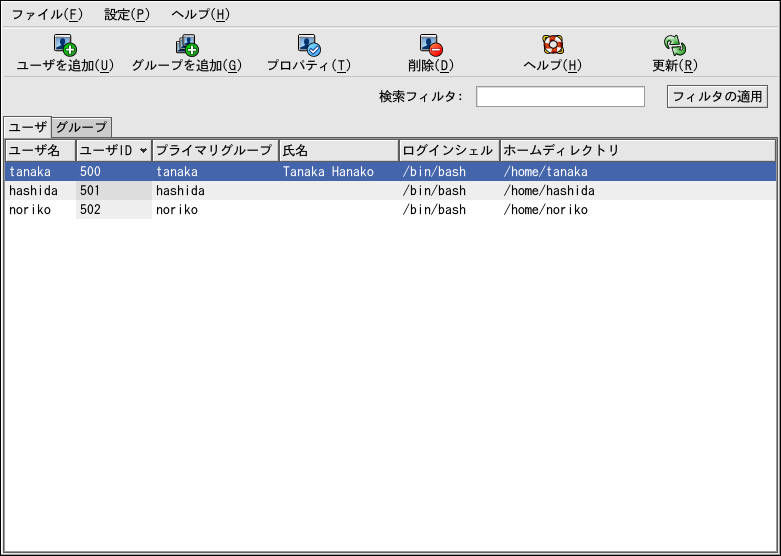 シェルプロンプトでredhat-config-usersと 入力してユーザーマネージャを起動する こともできます。