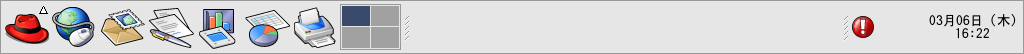 パネル: デスクトップの ツールバーで、通常、画面の底辺に横幅一杯に広がっています (図1-6を参照)。パネルは よく使用するプログラムをスタートするための メインメニューボタンとショートカットアイコン があります。パネルはニーズに合わせてカスタマイズすること もできます。