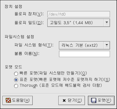ÁÖ ¸Þ´º => ½Ã½ºÅÛ µµ±¸ => Ç÷ÎÇÇ Æ÷¸ËÀ» ¼±ÅÃÇÏ¿© gfloppy¸¦ ½ÃÀÛÇÕ´Ï´Ù. ½© ÇÁ·ÒÇÁÆ®¿¡¼´Â /usr/bin/gfloppy¸¦ ÀÔ·ÂÇϽʽÿÀ. ±×¸² 4-2¿¡¼ º¸¿©ÁöµíÀÌ, gfloppy ÀÎÅÍÆäÀ̽º´Â ÀÛ°í ¸î°³ ¾ÈµÇ´Â ¿É¼ÇÀ» °¡Áö°í ÀÖ½À´Ï´Ù. ´ëºÎºÐÀÇ »ç¿ëÀÚÀÇ °æ¿ì ±âº» ¼³Á¤À» »ç¿ëÇϽøé ÃæºÐÇÕ´Ï´Ù; ÇÏÁö¸¸ ¿øÇÏ½Å´Ù¸é µð½ºÄÏÀ» MS-DOS ÆÄÀÏ ½Ã½ºÅÛ À¯ÇüÀ¸·Î Æ÷¸ËÇÒ ¼ö ÀÖÀ¸¸ç (ÀÏ¹Ý °í¹Ðµµ 3.5" 1.44MB µð½ºÄÏÀ» »ç¿ëÇÏÁö ¾Ê´Â °æ¿ì) Ç÷ÎÇÇ µð½ºÄÏÀÇ ¹Ðµµ¸¦ ¼±ÅÃÇÒ ¼öµµ ÀÖ½À´Ï´Ù. ¶ÇÇÑ ÀÌÀü¿¡ ext2·Î Æ÷¸ËµÈ µð½ºÄÏÀÌ ÀÖ´Ù¸é, ºü¸¥ Æ÷¸ËÇÒ ¼ö ÀÖ½À´Ï´Ù.