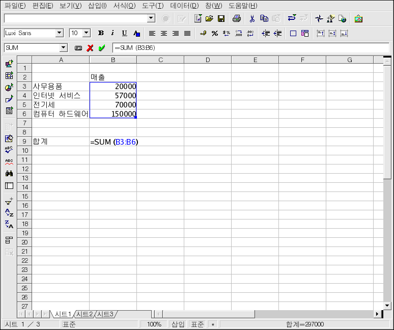 OpenOffice.org CalcÀ» »ç¿ëÇÏ¿© °³ÀοëÀ̳ª »ç¾÷¿ë µ¥ÀÌÅ͸¦ ÀÔ·ÂÇÏ°í ¼öÁ¤ÇÏ½Ç ¼ö ÀÖ½À´Ï´Ù. ¿¹¸¦ µé¾î ¿©·¯ºÐÀÌ °³ÀÎ ¿¹»ê¾ÈÀ» ÀÛ¼ºÇÑ´Ù°í °¡Á¤ÇÕ´Ï´Ù. A Çà¿¡´Â µ¥ÀÌÅÍ¿¡ ´ëÇÑ ¼³¸í (¿¹, Áý¼¼, ½Ä·áǰ, »ýȰºñ)À» ÀÔ·ÂÇϽðí B Çà¿¡´Â °³º° µ¥ÀÌÅÍÀÇ °ªÀ» ÀÔ·ÂÇÏ½Ã¸é µË´Ï´Ù. ¼¿¿¡ µ¥ÀÌÅ͸¦ ÀÔ·ÂÇϽ÷Á¸é ÇØ´ç ¼¿¿¡ µÎ¹ø Ŭ¸¯ÇϽðųª ÀÔ·Â ÁÙ (µµ±¸¹Ù »óÀÇ ÅØ½ºÆ® ¹Ú½º)¸¦ »ç¿ëÇÏ¿© Á¤º¸¸¦ ÀÔ·ÂÇÏ½Ç ¼ö ÀÖ½À´Ï´Ù. Á¤º¸ ÀÔ·ÂÀ» ¸¶Ä¡½Å ÈÄ, B Çà¿¡ »ê¼ú ¸í·ÉÀ» ½ÇÇàÇÏ¿© ÃѾ×À» °è»êÇØ º¸½Ê½Ã¿À. OpenOffice.org Calc¿¡´Â ¿©·¯°¡Áö »ê¼ú °è»ê ÇÔ¼ö (¿¹, ´õÇϱâ/°öÇϱâ: =SUM(), ³ª´©±â: =quotient(), ¿µ¼öÁõ ÃÑ¾× »êÃâ: =subtotal())ÀÌ ÀÌ¹Ì ¼³Á¤µÇ¾î ÀÖ½À´Ï´Ù. OpenOffice.org Calc¿¡¼ ¼öÄ¡ µ¥ÀÌÅ͸¦ °è»êÇÏ´Â ÇÔ¼ö¸¦ »ý¼ºÇÏ´Â ¹æ¹ý¿¡ ´ëÇÑ ÀÚ¼¼ÇÑ Á¤º¸¸¦ ¿øÇϽŴٸé, µµ¿ò¸» => ³»¿ëÀ» ¼±ÅÃÇÏ¿© ¹®¼ ÀڷḦ ÂüÁ¶ÇØ º¸½Ê½Ã¿À.