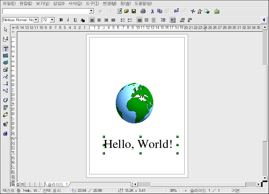 The GIMP¿Í °°Àº ÀÏ·¯½ºÆ®·¹ÀÌ¼Ç ±×·¡ÇÈ ÇÁ·Î±×·¥À» ÀÌ¹Ì »ç¿ëÇØ º¸¼Ì´Ù¸é, OpenOffice.org DrawÀÇ ÀϺΠ±âº» ±â´ÉÀÌ µ¿ÀÏÇÏ´Ù´Â »ç½ÇÀ» ½±°Ô ¾Ë ¼ö ÀÖ½À´Ï´Ù. (The GIMP¿Í °ü·ÃµÈ º¸´Ù ¸¹Àº Á¤º¸¸¦ ¿øÇϽøé 11 Àå ÂüÁ¶ÇϽñ⠹ٶø´Ï´Ù). Á÷¼±°ú °î¼±, »ç°¢Çü°ú ¿øÇü°ú °°Àº ±âº» ¸ð¾ç, ¿ø»Ô°ú Á¤À°¸éü¿Í °°Àº 3D ¹°Ã¼ µîÀ» ±×¸®´Âµ¥ »ç¿ëµÇ´Â µµ±¸¹Ù°¡ À§Ä¡Çϰí ÀÖ½À´Ï´Ù. À̹ÌÁö¸¦ ¸¸µå½Å ÈÄ ÁÖ µµ±¸¹Ù¿¡¼ ¿µ¿ª À¯Çü/ä¿ì±â µå·Ó´Ù¿î ¸Þ´º¸¦ »ç¿ëÇÏ¿© ±× À̹ÌÁö¸¦ ¿øÇϽô »ö»óÀ¸·Î ä¿öº¸½Ê½Ã¿À. ±×¸²¿¡ Ãß°¡ ÅØ½ºÆ®¸¦ »ðÀÔÇÏ´Â °Íµµ °¡´ÉÇÕ´Ï´Ù. OpenOffice.org Draw´Â ¶ÇÇÑ ¿ÜºÎ¿¡¼ °¡Á®¿Â À̹ÌÁö¸¦ ¿¾î¼ Á¦°øµÈ µµ±¸¸¦ °¡Áö°í ¼öÁ¤ÇÒ ¼ö ÀÖ´Â ±â´Éµµ Á¦°øÇÕ´Ï´Ù.