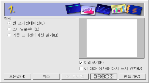 OpenOffice.org Impress¸¦ óÀ½ ½ÃÀÛÇϽøé, ÇÁ·¹Á¨Å×ÀÌ¼Ç ¼³Á¤ ȸéÀÌ ³ªÅ¸³³´Ï´Ù. ÀÌ È¸é¿¡¼ ¿øÇϽô ÇÁ·¹Á¨Å×ÀÌ¼Ç Çü½Ä¿¡ ´ëÇÑ ±âº» Á¤º¸¸¦ ¼³Á¤ÇØ ÁֽʽÿÀ. ½½¶óÀ̵å Çü½Ä, ½½¶óÀ̺긦 º¸¿©ÁÙ ¸Åü (Á¾ÀÌ, OHP (¿À¹öÇìµå ÇÁ·ÎÁ§ÅÍ)¿¡ »ç¿ëµÇ´Â Åõ¸í ¿ëÁö, ½½¶óÀ̵å, ¸ð´ÏÅÍ)¿Í ¿øÇϽŴٸé ÄÄÇ»ÅÍ¿¡¼ ÇÁ·¹Á¨Å×À̼ÇÇÒ ¶§ ½½¶óÀ̵忡 Àû¿ëÇÒ ½Ã°¢Àû È¿°úµµ ¼±ÅÃÇÏ½Ç ¼ö ÀÖ½À´Ï´Ù.