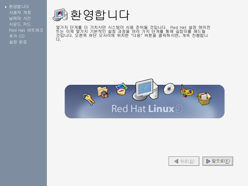 Red Hat Linux ½Ã½ºÅÛÀ» óÀ½À¸·Î ½ÃÀÛÇϽøé, Red Hat Linux ¼³Á¤À» µµ¿ÍÁÖ´Â ¼³Á¤ ¿¡ÀÌÀüÆ®°¡ ³ªÅ¸³¯ °ÍÀÔ´Ï´Ù. ¼³Á¤ ¿¡ÀÌÀüÆ®¸¦ »ç¿ëÇÏ¿© ½Ã½ºÅÛ ½Ã°£°ú ³¯Â¥¸¦ ¸ÂÃß°í, ¼ÒÇÁÆ®¿þ¾î¸¦ ¼³Ä¡Çϸç Red Hat Network¿¡ ¿©·¯ºÐÀÇ ½Ã½ºÅÛÀ» µî·ÏÇÏ´Â µîÀÇ ½Ã½ºÅÛ ¼³Á¤ ÀÛ¾÷À» ¼öÇàÇÏ½Ç ¼ö ÀÖ½À´Ï´Ù. ¼³Á¤ ¿¡ÀÌÀüÆ®°¡ ½Ã½ºÅÛ ¼³Á¤À» µµ¿ÍÁÖ´Â ´öºÐ¿¡ ¿©·¯ºÐÀº Red Hat Linux¸¦ ¼Õ½±°í Àçºü¸£°Ô »ç¿ëÇÏ½Ç ¼ö ÀÖ½À´Ï´Ù.