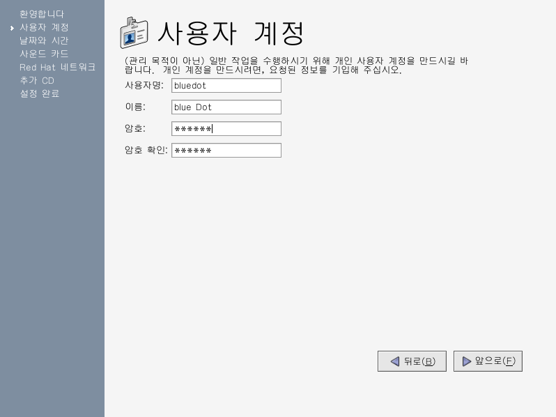 ¼³Á¤ ¿¡ÀÌÀüÆ®´Â ¸ÕÀú ÀÏ¹Ý ¿ëµµ·Î »ç¿ëÇÒ »ç¿ëÀÚ °èÁ¤À» »ý¼ºÇϽõµ·Ï ¿äûÇÒ °ÍÀÔ´Ï´Ù. ÀÏ¹Ý ÄÄÇ»ÅÍ ÀÛ¾÷¿¡ ·çÆ® »ç¿ëÀÚ·Î ·Î±×ÀÎÇϽô °ÍÀ» ±ÇÀåÇÏÁö ¾Ê½À´Ï´Ù. À߸øÇÏ¸é ½Ã½ºÅÛ¿¡ ¼Õ»óÀ» Áְųª ½Ç¼ö·Î ÆÄÀÏÀ» »èÁ¦ÇÒ ¼öµµ Àֱ⠶§¹®ÀÔ´Ï´Ù. ¼³Á¤ ¿¡ÀÌÀüÆ®¿¡¼ »ç¿ëÀÚ¸í, ¿É¼ÇÀ¸·Î °èÁ¤ À̸§, ¾ÏÈ£ (µÎ¹ø ÀÔ·Â)¸¦ ÀÔ·ÂÇϽñ⠹ٶø´Ï´Ù. ÀÌ·¯ÇÑ °úÁ¤À» ÅëÇØ Red Hat Linux ½Ã½ºÅÛ¿¡ ·Î±×ÀÎÇϴµ¥ »ç¿ëµÉ »ç¿ëÀÚ °èÁ¤ÀÌ »ý¼ºµÇ¸ç, ÆÄÀÏÀ» ÀúÀåÇÒ ¼ö ÀÖµµ·Ï ½Ã½ºÅÛ »ó¿¡ ÀÌ °èÁ¤ÀÇ È¨ µð·ºÅ丮°¡ ¸¸µé¾î Áý´Ï´Ù.