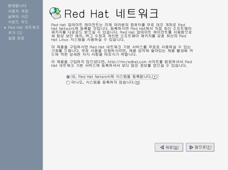Red Hat Network¿¡ ¿©·¯ºÐÀÇ ½Ã½ºÅÛÀ» µî·ÏÇÏ¿© ÀÚµ¿À¸·Î Red Hat Linux ½Ã½ºÅÛ ¾÷µ¥ÀÌÆ®¸¦ ¹ÞÀ¸½Ã·Á¸é, ¿¹, Red Hat Network¿¡ µî·ÏÇÕ´Ï´Ù¸¦ ¼±ÅÃÇϽñ⠹ٶø´Ï´Ù. ½Ã½ºÅÛÀ» Red Hat Network¿¡ µî·ÏÇÏ´Â °úÁ¤À» ÇÑ ´Ü°è¾¿ ÁøÇàÇϵµ·Ï µµ¿ÍÁÖ´Â À¯Æ¿¸®Æ¼ÀÎ Red Hat ¾÷µ¥ÀÌÆ® ¿¡ÀÌÀüÆ®°¡ ½ÃÀÛµÉ °ÍÀÔ´Ï´Ù. ¾Æ´Ï¿À, ½Ã½ºÅÛÀ» µî·ÏÇÏÁö ¾Ê½À´Ï´Ù¸¦ ¼±ÅÃÇÏ½Ã¸é µî·Ï °úÁ¤À» °Ç³Ê¶Ý´Ï´Ù. Red Hat Network¿Í ½Ã½ºÅÛ µî·Ï°ú °ü·ÃµÈ º¸´Ù ¸¹Àº Á¤º¸¸¦ ¿øÇϽŴٸé, http://www.redhat.com/docs/manuals/RHNetwork/ »çÀÌÆ®¿¡¼ Red Hat Network ¹®¼ ÀڷḦ ÂüÁ¶ÇϽñ⠹ٶø´Ï´Ù.