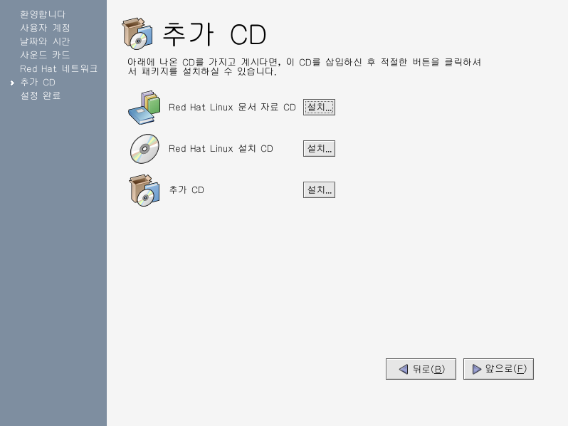 Ãß°¡ ¼ÒÇÁÆ®¿þ¾î ¼³Ä¡ ȸ鿡¼ ¼³Ä¡ °úÁ¤¿¡¼ ¼³Ä¡ÇÏÁö ¾ÊÀ¸¼Ì´ø Red Hat Linux RPM ÆÐŰÁö³ª Á¦3ÀÇ Á¦°ø ¾÷üÀÇ ¼ÒÇÁÆ®¿þ¾î, ¶Ç´Â °ø½Ä Red Hat Linux ¹®¼ CD·ÎºÎÅÍ ¹®¼ ÀڷḦ ¼³Ä¡ÇÏ½Ç ¼ö ÀÖ½À´Ï´Ù. ¼³Ä¡ÇÏ·Á´Â ¼ÒÇÁÆ®¿þ¾î³ª ¹®¼¸¦ Æ÷ÇÔÇÑ CD¸¦ »ðÀÔÇÏ½Ã°í ¼³Ä¡... ¹öưÀ» Ŭ¸¯ÇϽŠÈÄ ³ªÅ¸³ª´Â Áö½Ã »çÇ×À» µû¸£½Ê½Ã¿À.