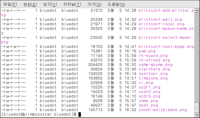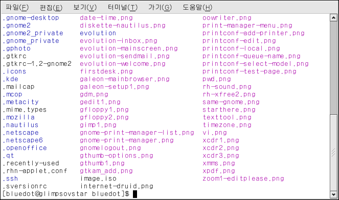 ls ¸í·É¾î¿Í ÇÔ²² ¿©·¯ ¸¹Àº ¿É¼ÇÀ» »ç¿ë °¡´ÉÇÕ´Ï´Ù. ls ¸í·É¸¸À¸·Î´Â µð·ºÅ丮¿¡ ÀÖ´Â ¸ðµç ÆÄÀÏÀ» º¼ ¼ö ¾ø½À´Ï´Ù. ÀϺΠÆÄÀϵéÀº ¼ûÀº ÆÄÀϵé (dot ÆÄÀÏÀ̶ó°íµµ ºÒ¸³´Ï´Ù)·Î¼ ÀÌ ÆÄÀϵéÀ» º¸±â À§Çؼ´Â ls ¸í·É¿¡ Ãß°¡ ¿É¼ÇÀ» ÁöÁ¤ÇÏ¿© »ç¿ëÇÏ¼Å¾ß ÇÕ´Ï´Ù.