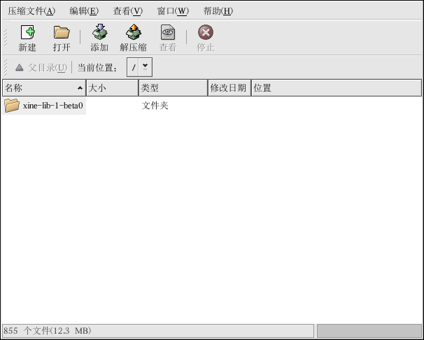 要启动 文件打包器,点击「主菜单」 => 「附件」 => 「文件打包器」。你还可以从 shell 提示下键入 file-roller 来启动文件打包器。图 14-1显示了运行中的文件打包器。
