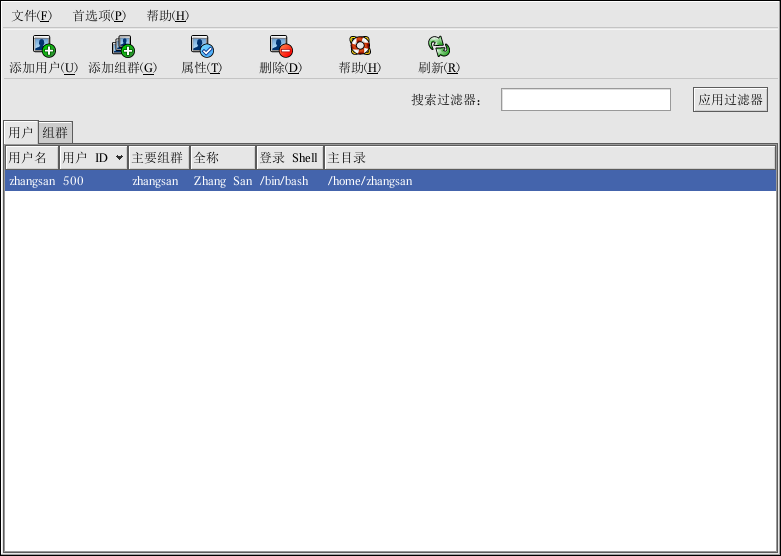 你也可以在 shell 提示下键入redhat-config-users 来启动 用户管理器。